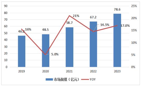 根据中研产业研究院发布的数据,中国普拉提行业市场规模从2018年的约46.2亿元人民币增加到2023年的约78.6亿元人民币。