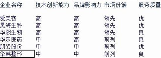 为了更直观地展示医疗美容市场中企业的竞争力状况,我们可以构建一个企业竞争力矩阵。该矩阵可以从多个维度出发,如技术创新能力、品牌影响力、市场份额、服务质量等,对企业进行综合评估。