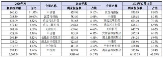 根据Wind数据统计,从2020年到2022年底,金融担保机构金融产品担保余额连续增长,分别达到5932.36亿元、8812.09亿元和9642.07亿元,呈现持续增长的趋势。然而,2022年的增速明显回落至9.42%,相对于2021年有所减缓。截至2022年底,前十大金融担保机构市场份额达到63.57%,较2021年底提高了0.73个百分点,表明行业的集中度略微上升,但整体仍然保持较高的集中度。