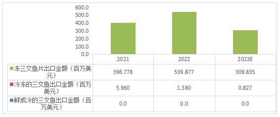 根据海关总署数据显示,2021-2023年三文鱼出口金额呈现波动趋势,2023年鲜或冷的三文鱼出口金额为0.0百万美元,冻的三文鱼出口金额为0.827百万美元,冻的三文鱼片出口金额为309.835百万美元。
