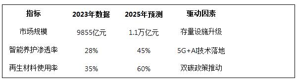 2023年中国公路养护市场规模达9855亿元(中研普华《2025-2030年中国公路养护行业竞争分析及发展前景预测报告》),五年增长1.8倍。核心增长引擎: