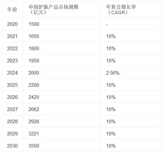 从上表可以看出,中国护肤产品市场规模持续扩大,年复合增长率保持在较高水平。预计到2030年,中国护肤产品市场规模将达到约3500亿元人民币,展现出巨大的发展潜力。