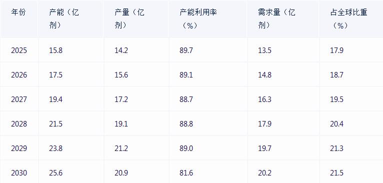 分析:从表中可以看出,2025-2030年中国疫苗行业的产能和产量将持续增长,产能利用率保持在较高水平。同时,疫苗需求量也将不断增长,占全球比重逐年提升。这表明中国疫苗市场具有巨大的发展潜力。