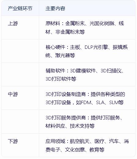 下游:主要包括航空航天、汽车制造、医疗健康等领域的企业。这些企业根据市场需求,将3D打印技术应用于实际场景中,推动产业持续发展。
