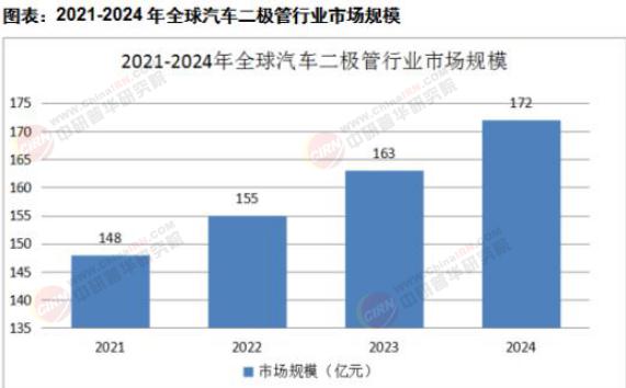 随着我国汽车电动化、智能化、网联化趋势的加速推进,新能源汽车对能量转换的需求日益增长,汽车电子领域正迎来一场结构性变革,将推动汽车级功率器件的快速发展,为汽车二极管市场带来新的增长点。从全球范围来看,全球汽车二极管市场规模稳步增长,2024年约为172亿元,同比增速为5.52%。从国内市场看,2024年中国汽车二极管市场规模约为58亿元,同比增长9.43%。