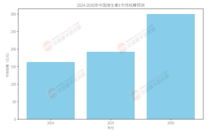 根据中研普华《2025-2030年中国维生素e行业市场深度调研及投资策略预测报告》预测,未来五年中国维生素E市场规模将持续增长。预计到2030年,中国维生素E市场规模将超过300亿元,年均复合增长率保持在较高水平。这一增长主要得益于消费者健康意识的持续提升、中老年人群需求的不断增加以及应用领域的不断拓展。