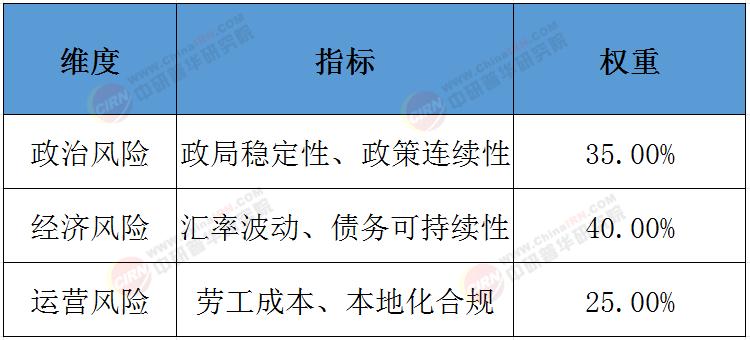 中研普华采用“三维度九指标”量化模型(见下表),覆盖政治、经济、运营三大类风险: