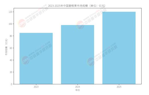 这张柱状图展示了2023-2025年中国碧根果市场规模的变化趋势。可以看出,中国碧根果市场规模在近年来呈现出快速增长的态势。预计未来几年内,随着健康饮食趋势的推动和本土种植技术的提升,中国碧根果市场规模将继续扩大并迎来更加广阔的发展前景。