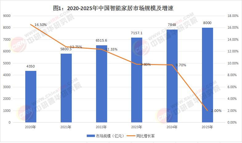 中国智能家居市场规模预计从2020年的4350亿元增长至2025年的8000亿元,年复合增长率达13%(图1)。