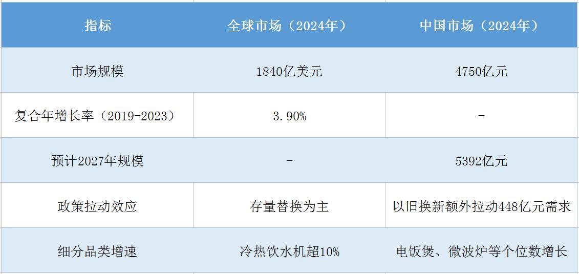 中国市场增速显著高于全球,主要受益于以旧换新政策拉动。商务部数据显示,2023年家电补贴已使用约280亿元,预计额外拉动448亿元更新需求。