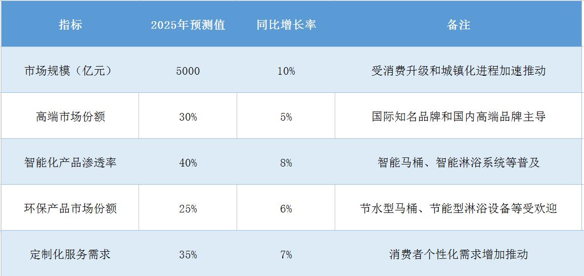 智能化、绿色化、定制化将成为未来中国整体卫浴行业的主流趋势。随着物联网、大数据、云计算等技术的不断发展和环保意识的日益增强,智能卫浴产品和环保卫浴产品将越来越受到市场的欢迎。同时,随着消费者对个性化需求的增加,定制化服务也将成为企业提升市场竞争力的重要手段。