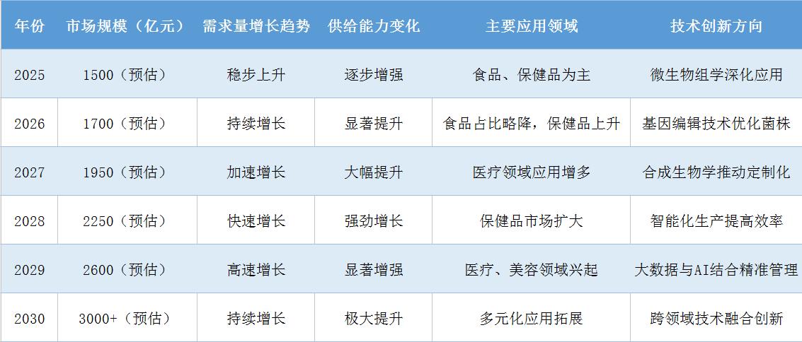 为了更直观地展示未来益生菌市场的供需格局和发展趋势,我们根据当前市场情况和历史数据进行了合理预测(注:以下数据为示意性描述,具体数值可能因市场波动、政策变化等因素而有所差异):