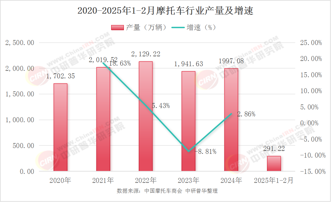 若1-2月产量291.22万辆为全年缩影,据中研普华产业研究院的《2024-2029年中国摩托车市场深度调查研究报告》预计全年产量或与2024年持平(约2000万辆)。