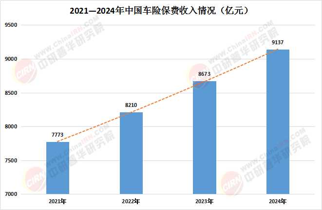 近年来,汽车保险市场规模持续扩大。公安部统计数据显示,2023年全国机动车保有量达4.35亿辆,其中汽车3.36亿辆,这为车险市场提供了庞大的潜在客户群体。从保费收入来看,2021年中国车险保费收入为7773亿元,同比下降5.72%,主要是由于车险综合改革导致车均保费下降;然而,随着新车销售回暖和保险意识的提升,2022年车险保费收入有所上升,达到8210亿元;2024年,车险保费整体收入更是达到约9137亿元,同比增长4.08%,首次突破9000亿大关。