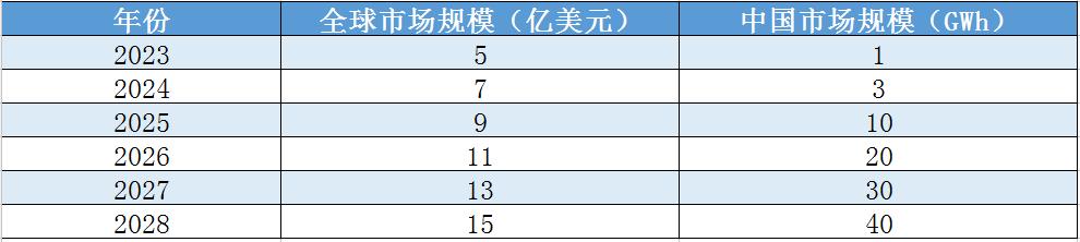 从表格中可以看出,未来五年钠电池行业的市场规模将呈现快速增长态势。全球市场规模预计将从2023年的5亿美元增长至2028年的15亿美元,复合年增长率高达24.5%。中国市场同样表现出强劲的增长势头,预计2025年市场规模将达到10GWh,到2028年将达到40GWh,复合年增长率高达58.5%。