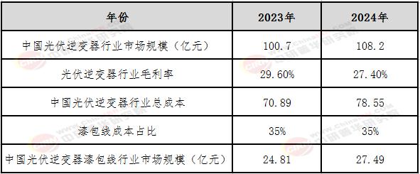 中研普华产业研究院数据显示,2023年、2024年中国光伏逆变器行业毛利率分别为29.6%、27.4%,同时在光伏逆变器的成本结构中,漆包线的成本占比约35%。按此测算2023年、2024年中国光伏逆变器漆包线的市场规模,测算过程如下: