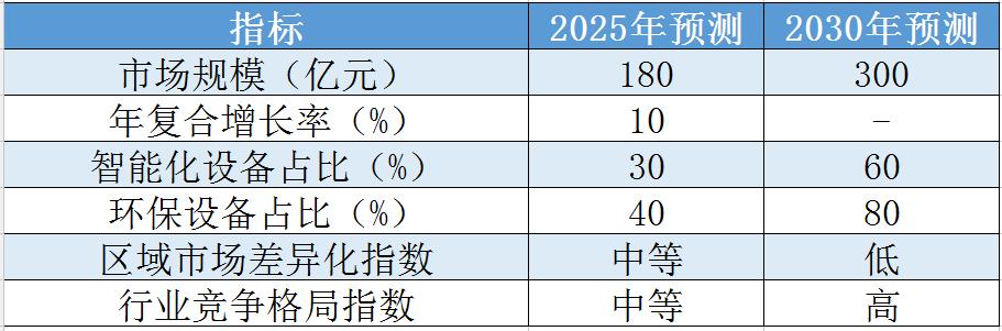 (注:表中数据为预测值,实际数据可能因市场波动、政策调整等因素有所变化。智能化设备占比和环保设备占比是基于市场发展趋势的预测,具体数值可能因技术进步和政策导向而有所调整。)