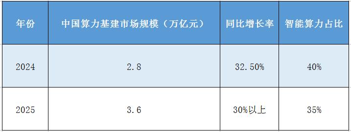 2024年中国算力基建市场规模突破2.8万亿元,同比增长32.5%,预计2025年将达3.6万亿元,继续保持30%以上的高速增长。在全球算力基建市场中,中国占比33%,其中基础算力占45%、智能算力40%、超算15%。