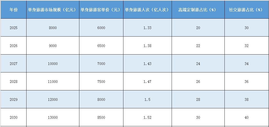 以下是根据中研普华产业研究院的预测数据整理的关于中国单身旅游市场未来五年的关键指标变化表: