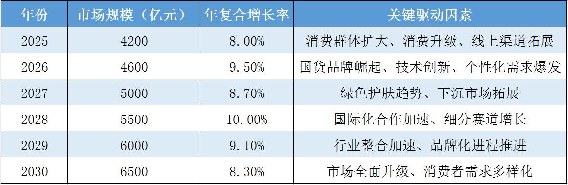 据中研普华产业研究院《2025-2030年面部护理品行业市场现状分析与发展趋势预测报告》预测,未来五年中国面部护理品市场将持续保持稳健增长态势。以下是未来五年市场规模的预测表格: