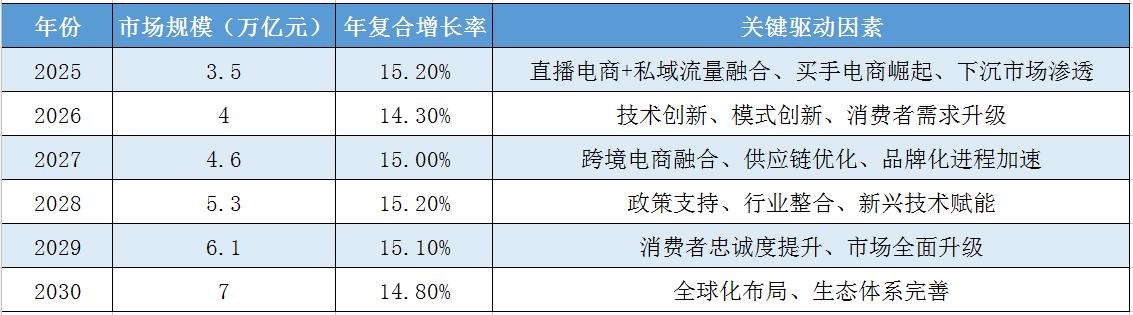 据中研普华产业研究院《2025-2030年中国社交电商行业深度分析及发展前景预测报告》预测,未来五年中国社交电商市场将持续保持稳健增长态势。以下是未来五年市场规模的预测表格: