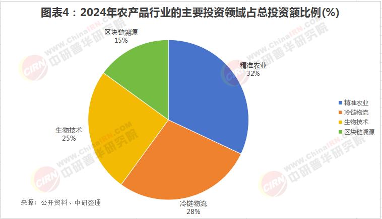 精准农业、冷链物流、生物技术和区块链溯源是当前农产品行业的主要投资领域。2024年精准农业占总投资额的32%,冷链物流占28%,生物技术占25%,区块链溯源占15%。