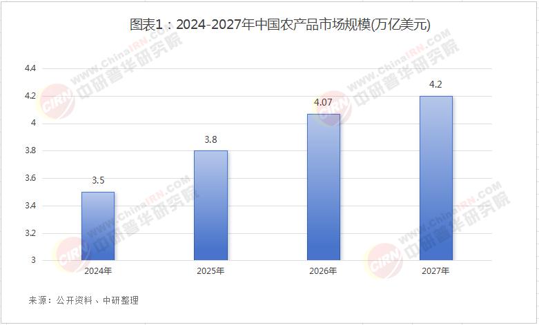 根据中研普华产业研究院发布《2025-2030年中国农产品行业跨境出海战略研究报告》显示分析,2024年中国农产品市场规模达到约3.5万亿美元,同比增长7.2%。这一增长主要得益于全球人口增长、消费升级以及健康饮食趋势的推动。预计2025年市场规模将增长至3.8万亿美元,同比增长8.5%。未来三年(2025-2027年),农产品市场将保持年均复合增长率(CAGR)约7%-8%的增长,到2027年市场规模有望突破4.2万亿美元。这一趋势反映了消费者对高品质、健康和可持续农产品需求的持续增长,同时也体现了技术进步对行业发展的推动作用。