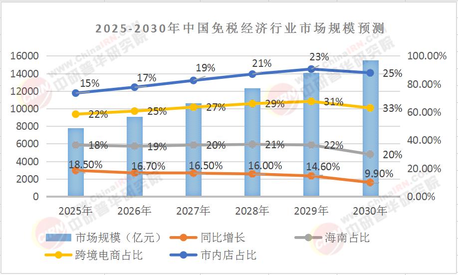 市场规模呈现"前高后稳"增长态势,2025-2028年为高速增长期,2029年后增速趋缓但总量持续扩大。值得注意的是,海南与跨境电商占比持续提升,市内店后来居上,三大核心赛道共同支撑起万亿市场。