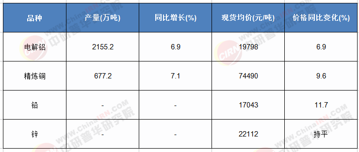 表1:2024年上半年中国主要有色金属产量及价格情况