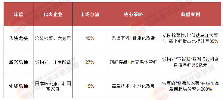 2025年,中国腌制食品行业形成“传统龙头主导、新兴品牌突围、外资品牌渗透”的竞争格局。CR5企业市占率从2020年的31%提升至48%,但区域性品牌仍占据细分市场(如湖南剁椒、云南菌菇腌制品)。