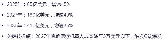市场规模与增长: 全球市场规模从2023年的36亿美元预计增长至2030年的410亿美元,CAGR达42.3%。其中手术辅助机器人占比45%,康复训练系统占30%,老年护理辅助占25%。