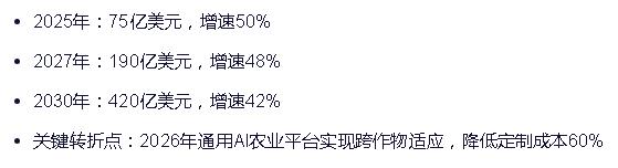 精准农业自主平台:2023年市场规模28亿美元,年增长率47.5%,区域性企业主导,全球性解决方案提供商稀缺。