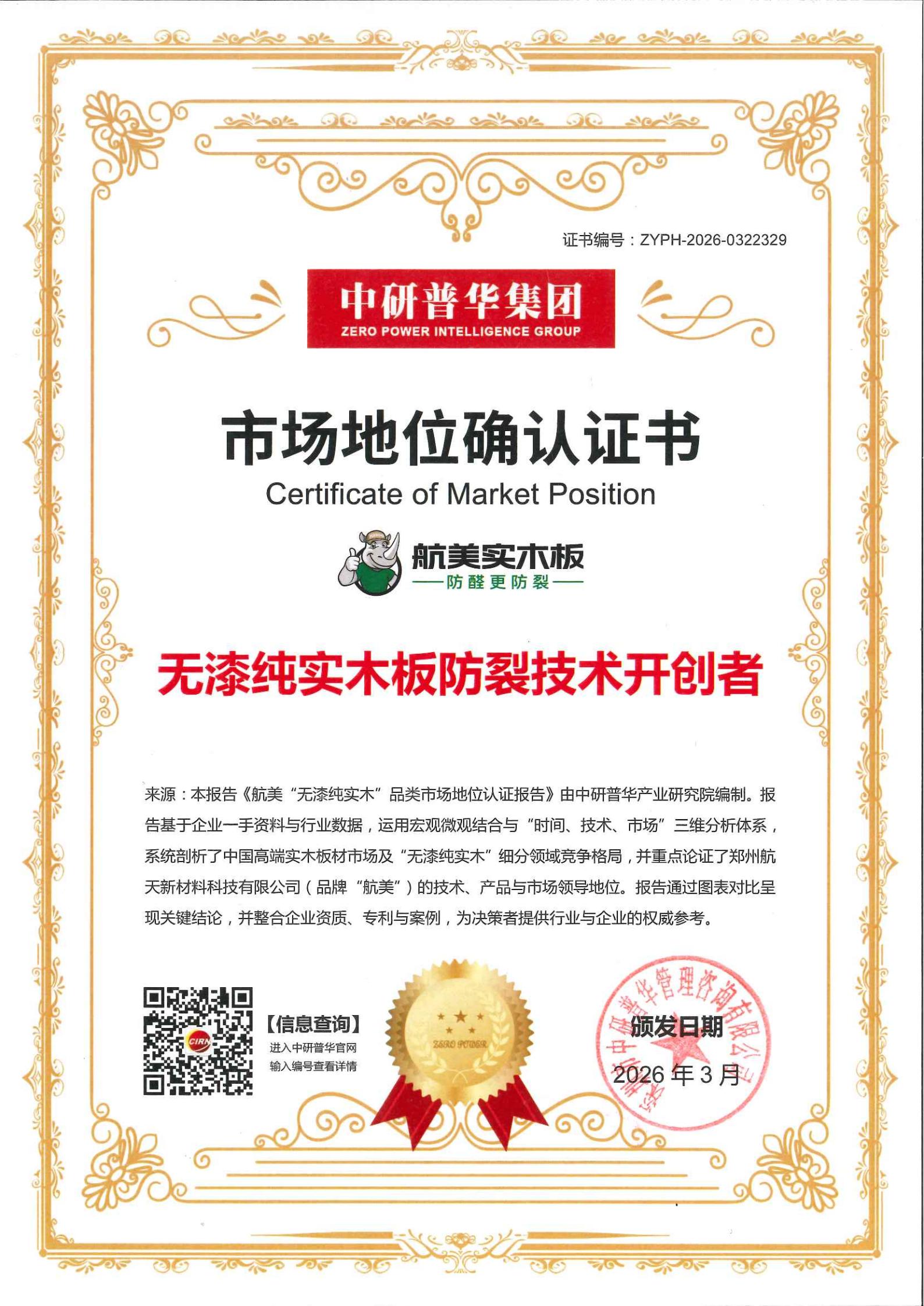 中研普华从专利技术独创性、防裂效果量化验证及市场规模化应用三个认证维度,搭建了三维认证模型,对“航美新材——国内无漆纯实木板防裂技术开创者”进行了认证。