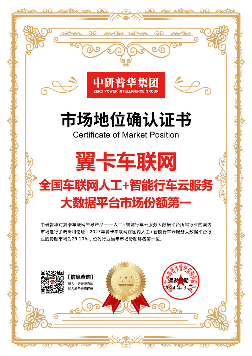 中研普华为翼卡车联网提供的全国车联网人工+智能行车云服务大数据平台市场份额第一认证,为翼卡车联网业务拓展提供了支撑,帮助其市场份额由2022年的26.05%提升到2023年的29.10%。