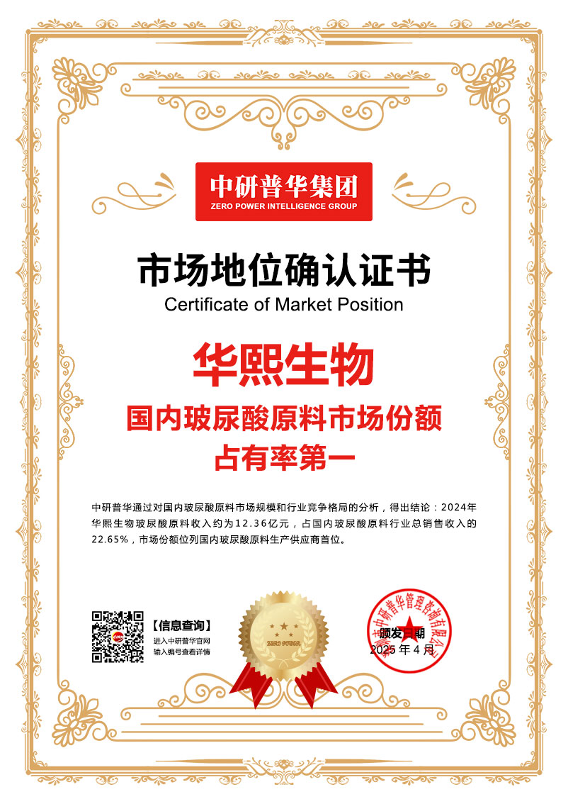 中研普华通过对国内玻尿酸原料市场规模和行业竞争格局的分析,得出结论:2024年华熙生物玻尿酸原料收入约为12.36亿元,占国内玻尿酸原料行业总销售收入的22.65%,市场份额位列国内玻尿酸原料生产供应商首位。