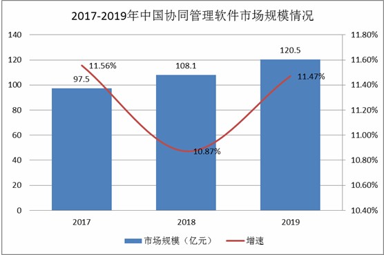 近几年,不同单位之间的协同作用日益凸显,协同控制的需求逐年提高,对应的协同管理软件市场销售情况良好。2019年中国协同管理软件行业市场规模约为120.5亿元,较2018年上涨了11.47%。