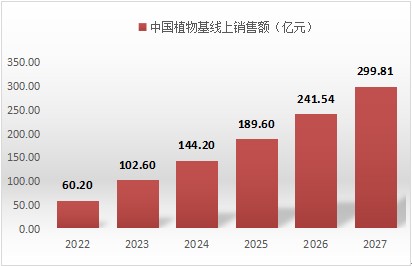 2019-2021年植物基各类产品线上下配售额呈现逐年快速增长趋势,2021年植物基产品销售额达34.1亿元。随着健康消费理念的深入,植物基产品多元化的发展,预计2022-2027年植物基产品将保持快速增长趋势,2027年植物基产品线上销售额将达299.81亿元。