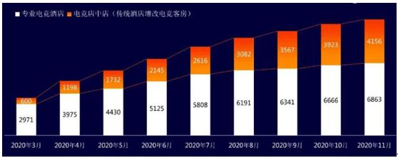 从数据来看,2020年3-11月,全国电竞酒店数量直线破万,总额呈明显的上升之势,平均月增速约为130%,行业规模持续扩大。值得关注的是,随着电子竞技热度持续上升、疫情影响下消费升级的市场需求、多电竞扶持政策的相应出台,国内电竞酒店的数量爆发增加,逐步成为传统酒店及网吧转型升级的主要方向。