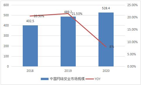 2018-2020年我国网络安全市场规模持续增长,2018-2020年年复合增长率达到14.57%,市场规模从2018年的402.5亿元增长至528.4亿元。