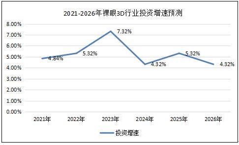 预测2021年裸眼3D行业投资增速为4.84%,2026年裸眼3D行业增速为4.32%,预测2021-2026年裸眼3D行业投资增速在5%左右。