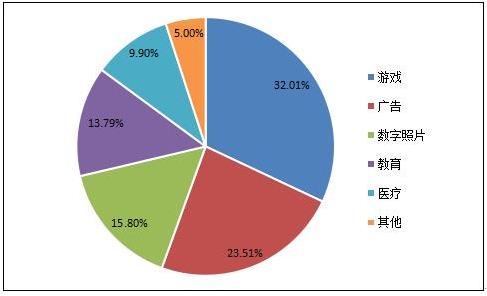 游戏行业占比32.01%,广告行业占比23.51%,数字照片占比15.8%,教育占比13.79%,医疗占比9.9%。