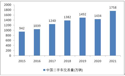 图表:2015-2021年中国二手车交易量