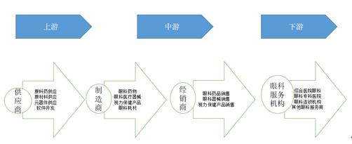 眼科医疗器械上游主要包括元器件的供应,软件开发,中游包括医疗器械和眼科耗材,下游则为经销商和各类眼科服务机构。