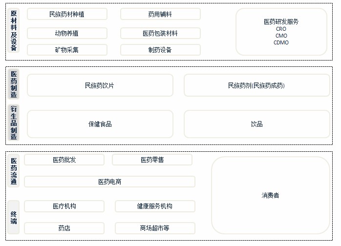 民族药(剂)产业链是指从民族药材种植,到民族药产品(民族药饮片、民族药成药、功能性食品、保健品等)的生产加工过程,到达终端消费者的各个环节所构成的产业链条。民族药产业链较长,包括上游民族药原材料种植、中游民族药加工制造、下游民族药流通业等主体环节,最