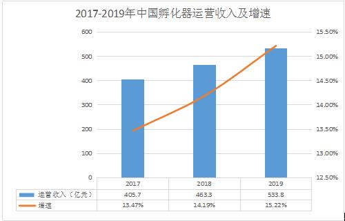 2019年,中国孵化器的运营收入约为533.8亿元,较2018年上涨了15.22%。近几年,孵化器的数量有较大幅度的增长,截至2019年底,国内孵化器数量约为5600家,服务的创业团队规模也有较大的提高,行业增速明显。