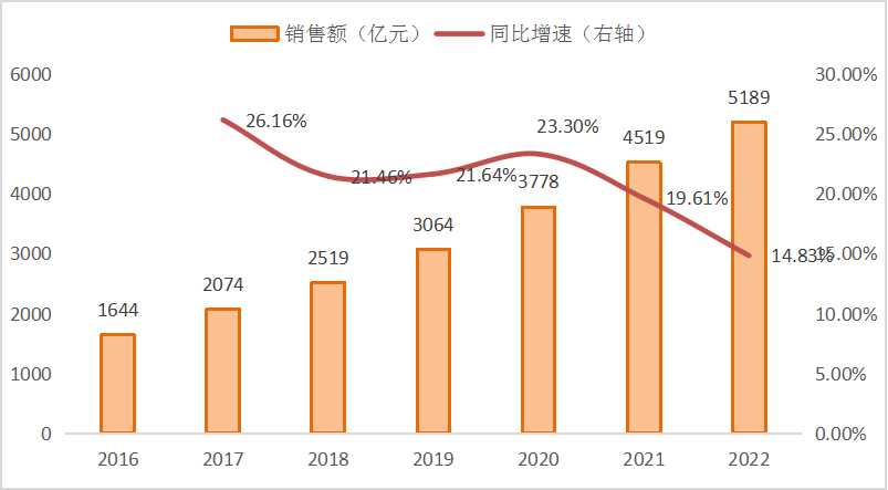 图:2016-2022年我国集成电路设计产业销售额