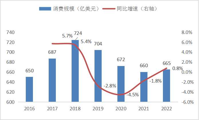 图:2016-2022年全球软体家具的消费规模