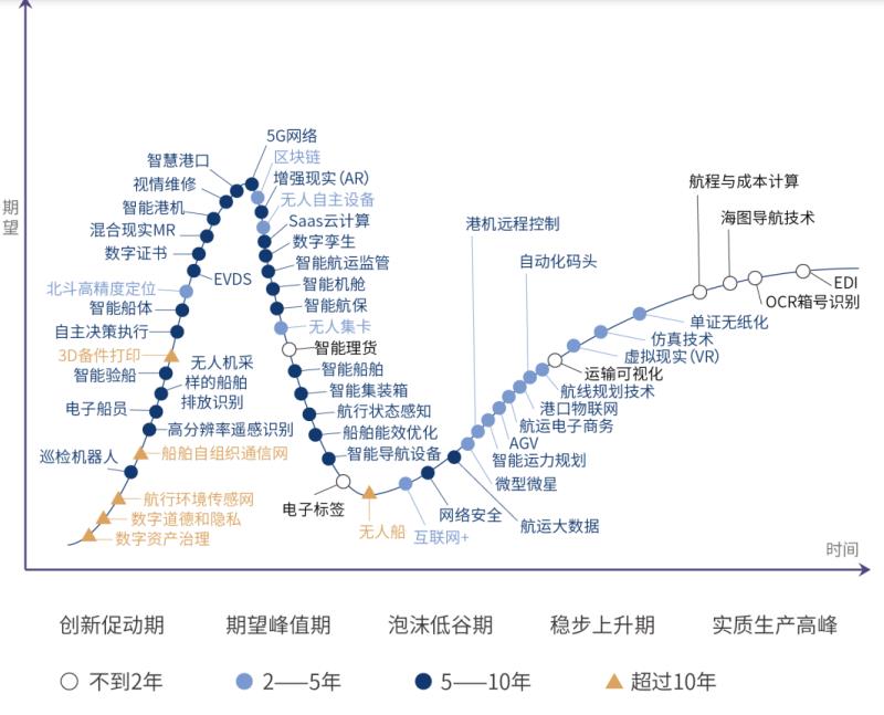 根据上海国际航运研究中心编写的《全球港航信息化发展报告2019版》,目前期望峰值较高的有智慧港口、5G网络、智能航运监管等技术,而航运大数据、港机远程控制技术、港口物联网等技术正在步入稳步上升期。
