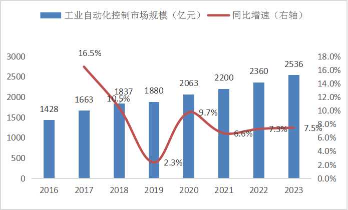 图:2016-2023年我国工业自动化控制市场规模及预测