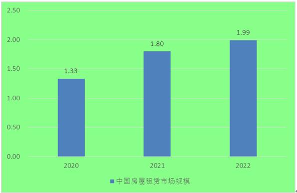 2020年中国房屋租赁市场规模达到了1.33万亿元,2022年达到了1.99万亿元。